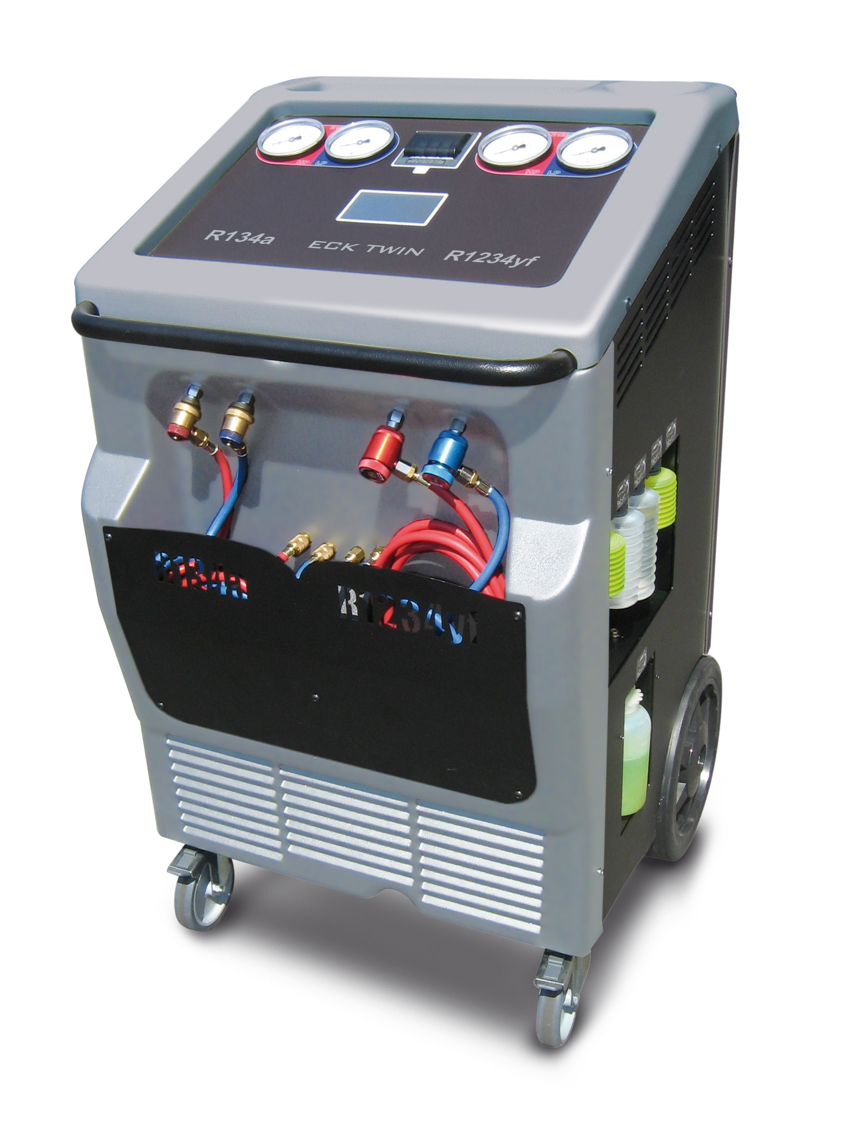 Ecotechnics ha sviluppato una stazione dual gas automatica per impianti con gas R134a e HFO-1234yf: Eck Twin. La macchina dispone di due circuiti separati, due compressori, due condensatori, due serbatoi , due coppie di tubi e di raccordi, quattro manometri, display touchscreen grafico a colori di uso intuitivo. Si può passare da un impianto R134a a quello HFO-1234yf molto rapidamente.
